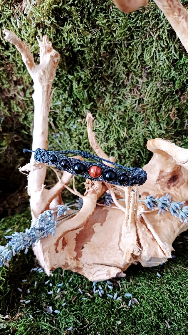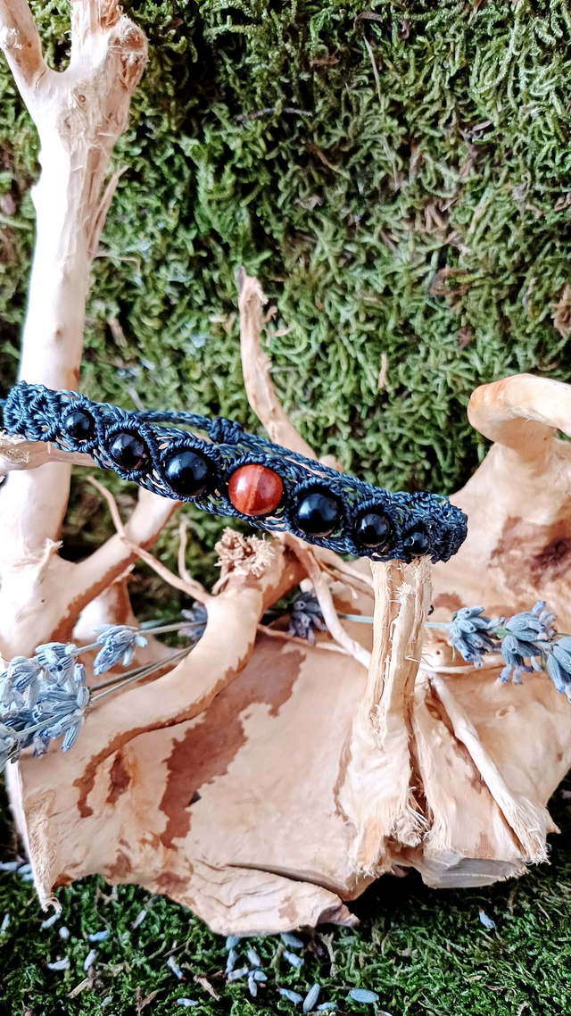 Matériaux : Fil linhasita, Jaspe rouge, Obsidienne noire, Quartz fumé, Tourmaline noire